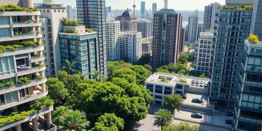 City skyline with buildings, green space