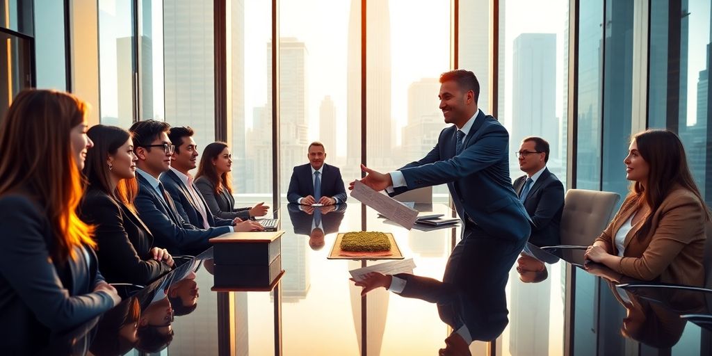 Business professionals shaking hands in modern boardroom overlooking city skyline