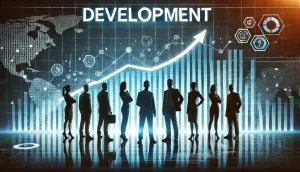 DALL·E 2024-12-25 11.28.57 – A group of silhouetted business people standing in front of a large graph showing growth and development, with upward-trending lines and bars. The wor